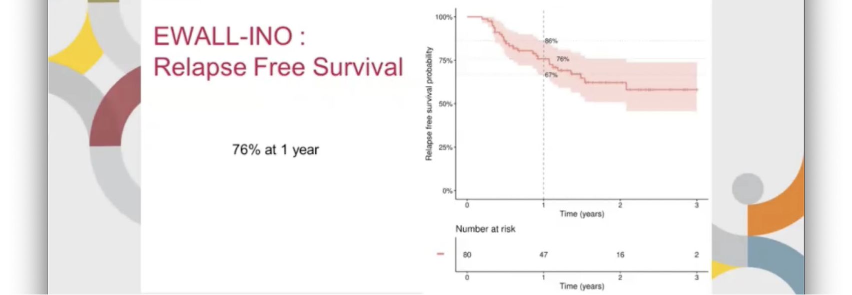 研究结果显示,总体来说患者耐受还是很好的,肝毒性的发生率是8.8%。一共有90例患者纳入分析,有6例患者在3个疗程的强化治疗后做了移植。大部分患者没有做移植。整体患者一年的预期总生存率是78.5%,无病的生存率是74.5%,在老年B-ALL取得非常好的结果。