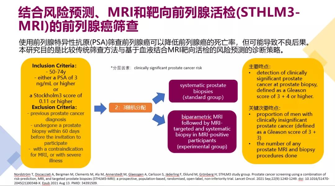 来自斯德哥尔摩的一项研究提出了一种结合风险预测、MRI和靶向穿刺活检的前列腺癌筛查模式——STHLM3-MRI。这种新的模型整合了蛋白标志物、基因标志物以及临床数据多个变量,减少了36%的MRI靶向活检及8%的传统活检程序,同时提高临床显著性前列腺癌(GS≥7分)检出率。