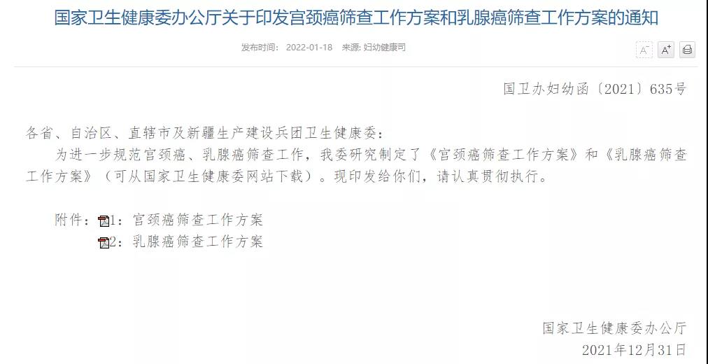 国家卫生健康委1月18日发布《宫颈癌筛查工作方案》和《乳腺癌筛查工作方案》,提出为适龄妇女提供宫颈癌、乳腺癌筛查(“两癌筛查”)服务。