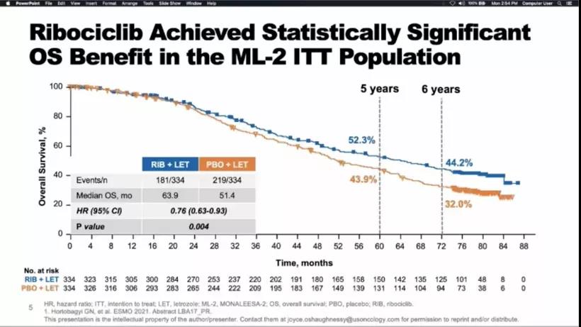 2021年ASCO大会上,MONALEESA-3研究结果更新,结果显示与安慰剂+氟维司群治疗相比,ribociclib联合氟维司群治疗绝经后HR+/HER2-晚期乳腺癌患者可显著改善整组人群的OS(53.7个月 vs. 41.5个月,HR=0.726;95%CI:0.588~0.897),OS获得12.2个月的延长。