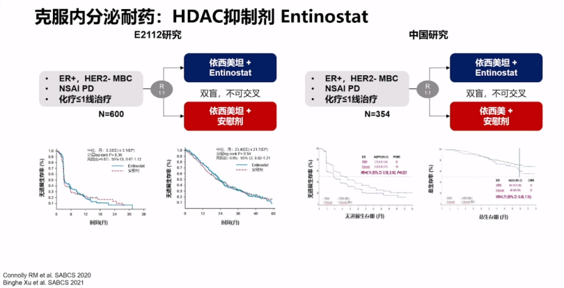 HDAC抑制剂恩替诺特(Entinostat)似乎也有CDK4/6抑制剂耐药后使用的潜质。国际的E2112研究对于非甾体AI治疗进展后的ER+/HER2-晚期乳腺癌患者中,依西美坦联合恩替诺特较安慰剂联合依西美坦未能显示出明显优势。我国徐兵河院士牵头的类似临床设计则显示了依西美坦联合恩替诺特较安慰剂联合依西美坦在mPFS以及OS的获益,再次印证了HDAC抑制剂在亚洲人种获益更明显的特质,为临床提供更多选择。