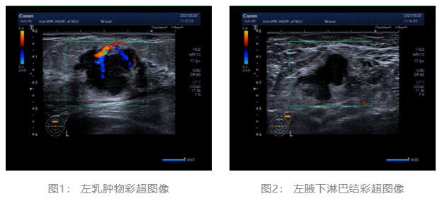 2021.06.30 乳腺彩超:左侧乳腺低回声团块,BI-RADS-US 4c类。左侧腋窝肿大淋巴结。(图1、2)