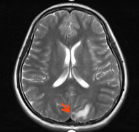 3.头增强MRI:左枕叶强化结节(长径1.3cm,靶病灶2),周围伴水肿,转移可能。(图3)
