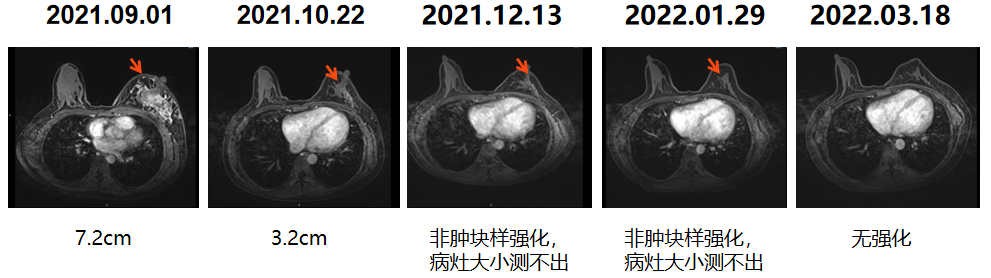 1.靶病灶1(乳腺原发病灶)评效:2周期部分缓解PR,4-6周期乳腺病灶呈非肿块样强化,无法测量病灶大小,8周期复查无强化,疗效达CR。(图7)