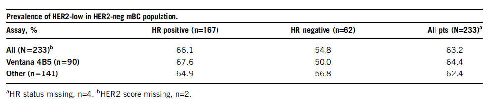 研究背景:传统上定义为HER2阴性(HER2-)的乳腺癌中,约50%患者为HER2低表达(HER2-low:IHC 1+或2+,但ISH-;Miglietta, NPJ Breast Cancer 2021)。目前,抗HER2靶向治疗用于HER2-low转移性乳腺癌的研究正在进行中(如Ⅲ期DESTINY-Breast04研究;NCT03734029),但是现有HER2检测方法对筛选应用抗HER2治疗的HER2高表达患者有效,对HER2-low的检测价值并不确定。最近的一项研究发现,使用当前IHC方法进行HER2评判,结果为0和1+的一致性相对较差(一致性<70%)(Fernandez, JAMA Oncol 2022)。本研究旨在评估HER2阴性转移性乳腺癌患者中HER2-low人群的流行病学特征,并描述HER2-low与HER2 0转移性乳腺癌的疾病特征。计划纳入1000例患者,前233例将进行初步结果报告。