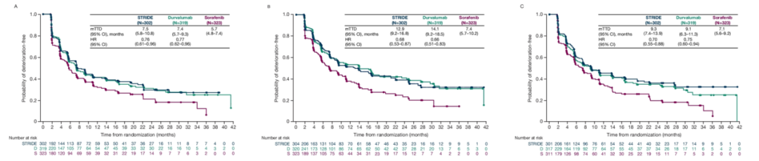 HIMALAYA研究预先设定的次要终点为评估受试者接受STRIDE方案(T 300 mg+D 1500 mg[一剂]+D 1500 mg每4周一次[Q4W];N=393)或D组(1500 mg Q4W;N=389)vs S组(400 mg每天两次;N=389)的患者报告结局(PRO)。采用欧洲癌症研究与治疗组织(EORTC)30项生活质量(QoL)问卷和18项HCC生活质量问卷用于患者自身评估疾病相关症状、身体功能(PF)和全球健康状况(GHS)/QoL。至恶化时间(TTD),定义为从随机分组到随后就诊或死亡时确认的首次具有临床意义恶化(恶化≥10 分)时间,在症状基线评分≤90 或PF和GHS/Qol基线评分≥10 的患者中进行评估。