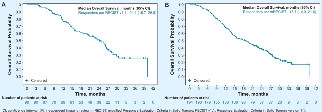 图4. 仑伐替尼基于(A)RECIST v1.1(B)mRECIST的总生存期结果