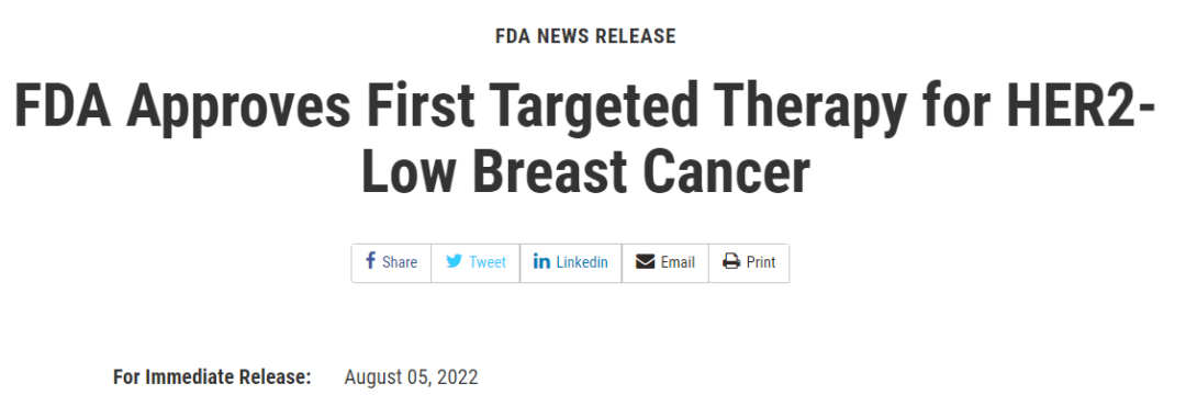 美国当地时间2022年8月5日,基于一项多中心III期临床研究DESTINY-Breast04的出色结果,FDA加速批准了德曲妥珠单抗(Trastuzumab Deruxtecan, T-DXd)用于治疗无法切除或转移性HER2低表达乳腺癌患者的适应症,相较于此前预计的时间提前了4个月。这是全球首个获批针对HER2低表达乳腺癌亚型患者的疗法,该亚型是新定义的HER2阴性乳腺癌亚型,意味着曾经被划分进TNBC的HR-/HER2低表达患者也可能获得了靶向治疗的机会。