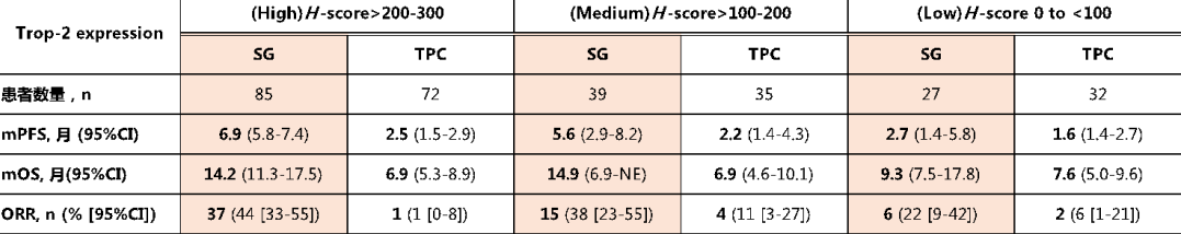 戈沙妥珠单抗针对TNBC患者进行的三期临床研究ASCENT的结果显示,SG组的mPFS为5.6个月,mOS为12.1个月[9]。此外,根据亚组分析的结果显示,戈沙妥珠单抗面对不同Trop2表达的人群,疗效表现出差异,总体上Trop2表达越高,效果越好,但因为Trop2的表达水平不易检测,临床上以此为依据进行精准治疗仍存在一定障碍。