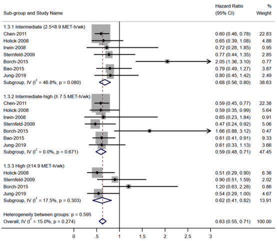 前瞻性观察研究检查了诊断后锻炼对乳腺癌幸存者死亡率的影响,通过使用不同的分界点,根据身体活动水平对患者进行分组(即诊断后锻炼对乳腺癌幸存者死亡率的影响)。由于各研究的分类不一致,meta分析中使用了以下体育活动水平:低水平体育活动,0~≤3 MET-h/周;中等水平的体育活动,2.5~<8.9 MET-h/周;中级至高级体力活动,≥7.5 MET-h/周;高强度体力活动,≥14.9 MET-h/周(图4)。