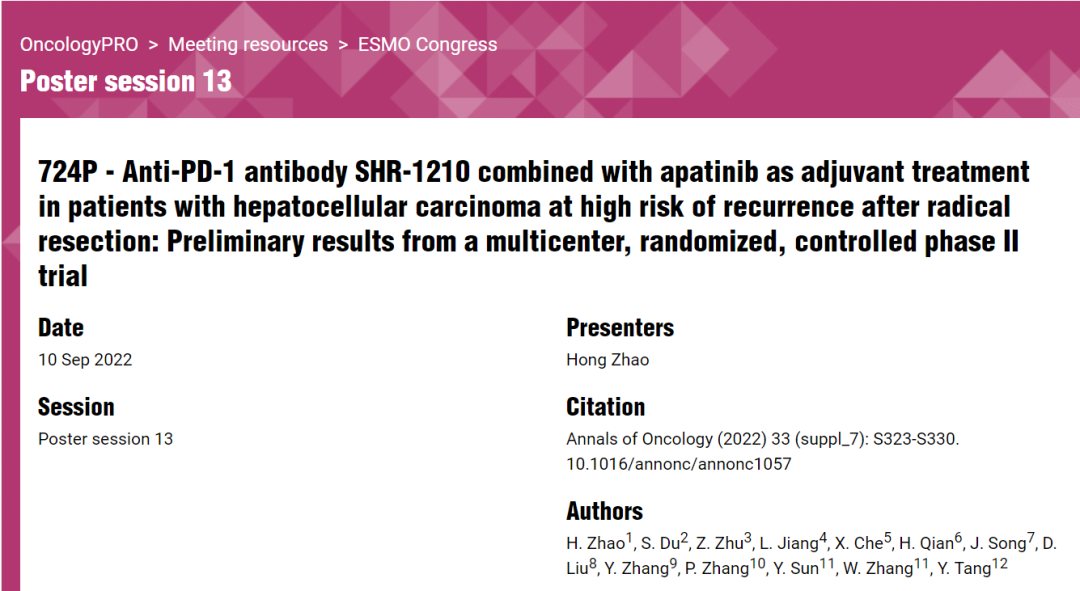 Zhao Hong et al. Anti-PD-1 antibody SHR-1210 combined with apatinib as adjuvant treatment in patients with hepatocellular carcinoma at high risk of recurrence after radical resection: Preliminary results from a multicenter, randomized, controlled phase II trial. ESMO 2022, abstract 724P.