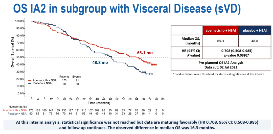 结论:MONARCH 3研究的第二次中期分析显示,无论意向治疗人群还是内脏转移亚组,在NSAI基础上联合阿贝西利一线治疗可使HR+/HER2- ABC患者OS延长1年以上,目前数据尚未成熟,未达统计学差异,预计在2023年(ITT人群至少315个事件、内脏转移亚组至少189个事件)进行最终分析。此外,阿贝西利可推迟患者无化疗生存时间,在长期随访中安全性良好。