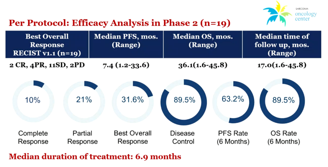 结果:共有26例LMS患者,安全性分析(n=26):13/26(50%)的患者发生>3级TRAE,包括ALT升高5例,蜂窝织炎、AST升高、乏力2例、贫血各2例,血小板计数降低、白细胞减少、碱性磷酸酶升高1例、TSH降低、TSH升高、T4升高、CK升高各1例。没有脱发和心脏毒性的发生。MTD为1.2mg/m2。疗效分析:22/26(84.6%)例患者是有效的。在1期阶段,既往经过治疗的3例患者(100%)均达到SD;2期扩展阶段,19例既往未经治疗中,CR 2例,PR 4例,SD 11例,PD 2例。总体缓解率为31.6%,疾病控制率为89.5%。中位PFS为7.4个月(范围:1.2~33.6),中位OS为36.1个月(范围:1.6~45.8);6个月PFS率为63.2%;6个月OS为89.5%。