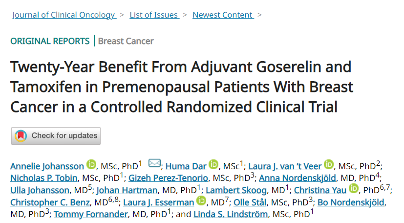 STO-5研究:戈舍瑞林联合他莫昔芬辅助治疗绝经前乳腺癌患者的二十年获益