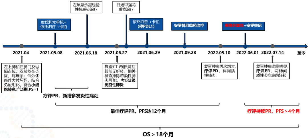 该例患者为广泛期小细胞肺癌,依据2021年CSCO小细胞肺癌诊疗指南及NCCN指南推荐,一线应用度伐利尤单抗联合EC方案化疗,疗效佳,但很快出现2级免疫性肺炎。二线安罗替尼治疗期间,肿瘤退缩不明显。2022年ASCO大会口头报道的ASTRUM-005研究中斯鲁利单抗有较好的安全性,后线尝试斯鲁利单抗联合安罗替尼治疗,令人惊喜的是,肿瘤出现明显退缩,2周期后影像学检查提示疗效即达到PR,疗效显著。