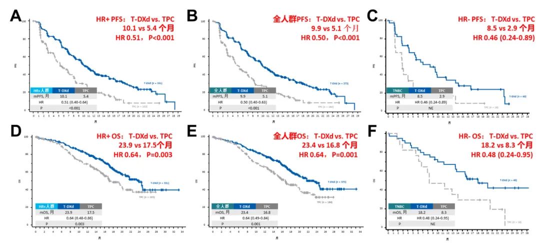 图8.DESTINY-Breast04研究结果.A:HR+/HER2 low人群中的PFS分析;B:总人群中的mPFS分析;C:HR-/HER2 low(TNBC)人群中的PFS分析;D:HR+/HER2 low人群中的OS分析;E:总人群中的OS分析;F:HR-/HER2 low(TNBC)人群中的OS分析