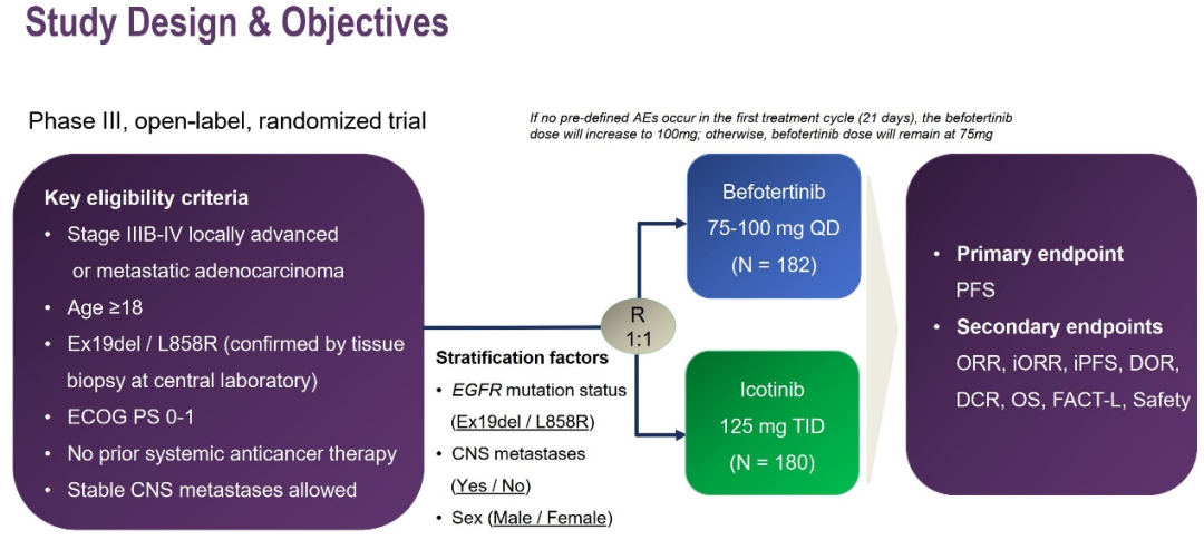 这项多中心、III期、开放标签的随机对照研究,纳入IIIb-IV期的局部晚期或转移性初治肺腺癌患者,患者携带EGFR 19del或21L858R突变,PS评分0~1分,稳定性脑转移患者允许入组。研究基于EGFR突变状态、是否有中枢神经系统转移以及性别进行分层。符合入组标准的患者接受贝福替尼“100mg(75mg导入21天),口服,每日一次“治疗或”埃克替尼125mg,口服,每日三次“治疗。该研究主要终点为独立评审委员会评估的PFS,次要研究终点为ORR及安全性等。