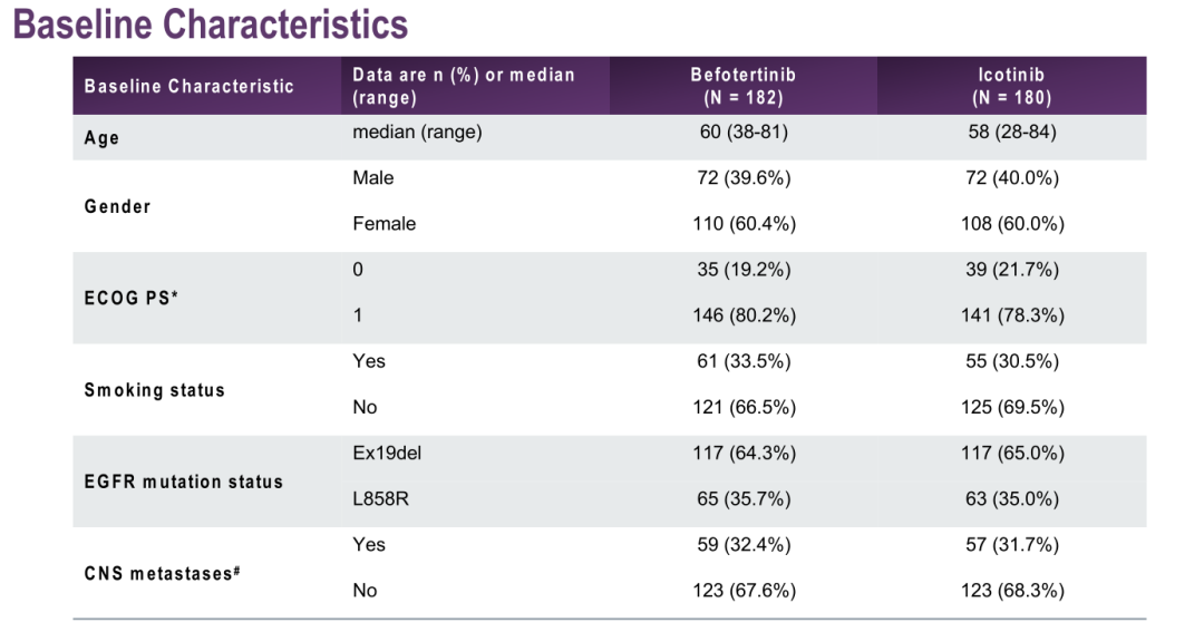 研究在中国39家中心进行,最终有362例患者接受随机化分组,贝福替尼组和埃克替尼组分别有182例和180例患者,两组基线特点均衡可比,中位随访时间分别为20.7个月和19.4个月,并分别有32.4%和31.7%的患者基线存在脑转移。