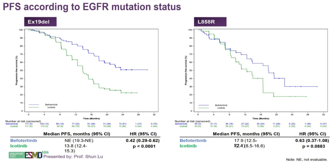 不同EGFR突变类型的患者均可以从一线贝福替尼的治疗中获益。携带19del的患者,两组中位PFS分别为未达到和13.8个月,HR=0.42,P<0.0001;携带21L858R突变的患者,两组中位PFS分别为17.9个月和12.4个月,HR=0.63,P=0.0883。