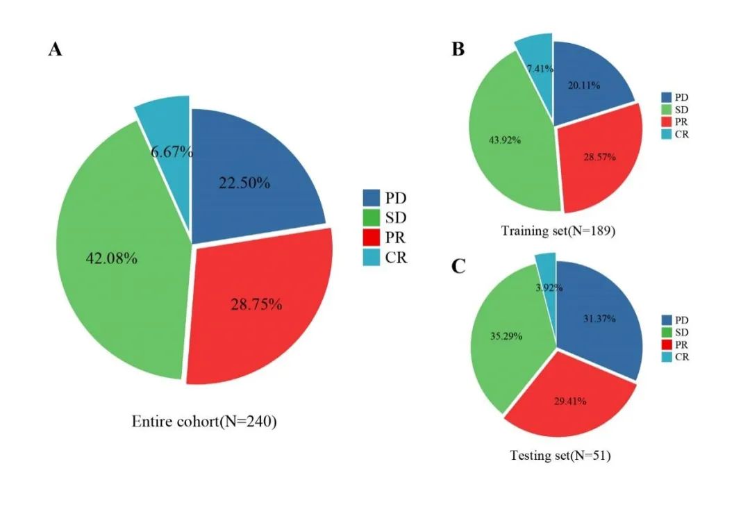 研究结果:入选的240例患者中,6.7%的患者疗效为CR,28.8%的患者为PR,42.1%的患者为SD,总的疾病控制率(DCR)为77.5%,免疫联合治疗反应在训练集和测试集中是均衡的。