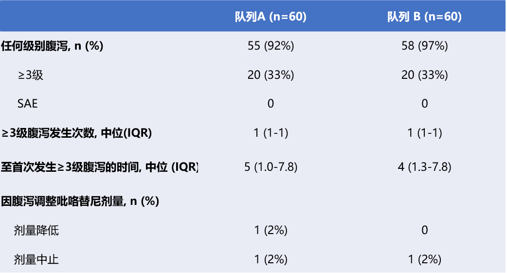 2021年1月至2022年5月期间,子研究完成了120例患者(每个队列60例)的入组。两个队列的基线特征见表1。队列A中20/60例(33%)患者和队列B中20/60例(33%)患者报告了≥3级腹泻(表2)。每个队列各有3例(5%)患者发生便秘事件,均为1级或2级。队列A中1例(2%)患者和队列B中2例(3%)患者因便秘而降低洛哌丁胺剂量,无患者停用洛哌丁胺。在前3个月内,两个队列的FACT-B总分相似,而队列B在第6个月和第9个月的FACT-B总分较高(图1)。