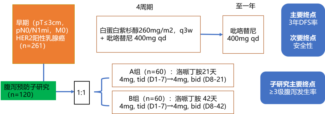 子研究的主要终点是≥3级腹泻的发生率。子研究的次要终点包括前2个辅助治疗周期的腹泻发生率和严重程度、便秘的发生率和严重程度、≥3级腹泻的发生时间、频率和持续时间、腹泻与研究药物的关系、剂量减少的发生率、因腹泻导致的停药和住院,以及使用癌症治疗功能评估-乳腺癌(FACT-B)进行的生活质量问卷评分。