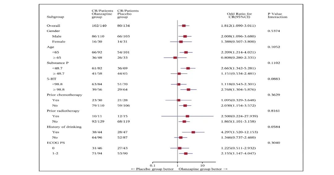 在亚组分析中可以看到几乎所有亚组中,与安慰剂组相比,奥氮平组均观察到完全缓解和无恶心获益。该研究是目前全球首个针对接受多日高致吐化疗患者的大型III随机对照研究。该研究为此类患者CINV的预防提供了新的循证医学证据,该治疗方案必将成为多日化疗患者的最佳止吐策略推荐在临床中使用。