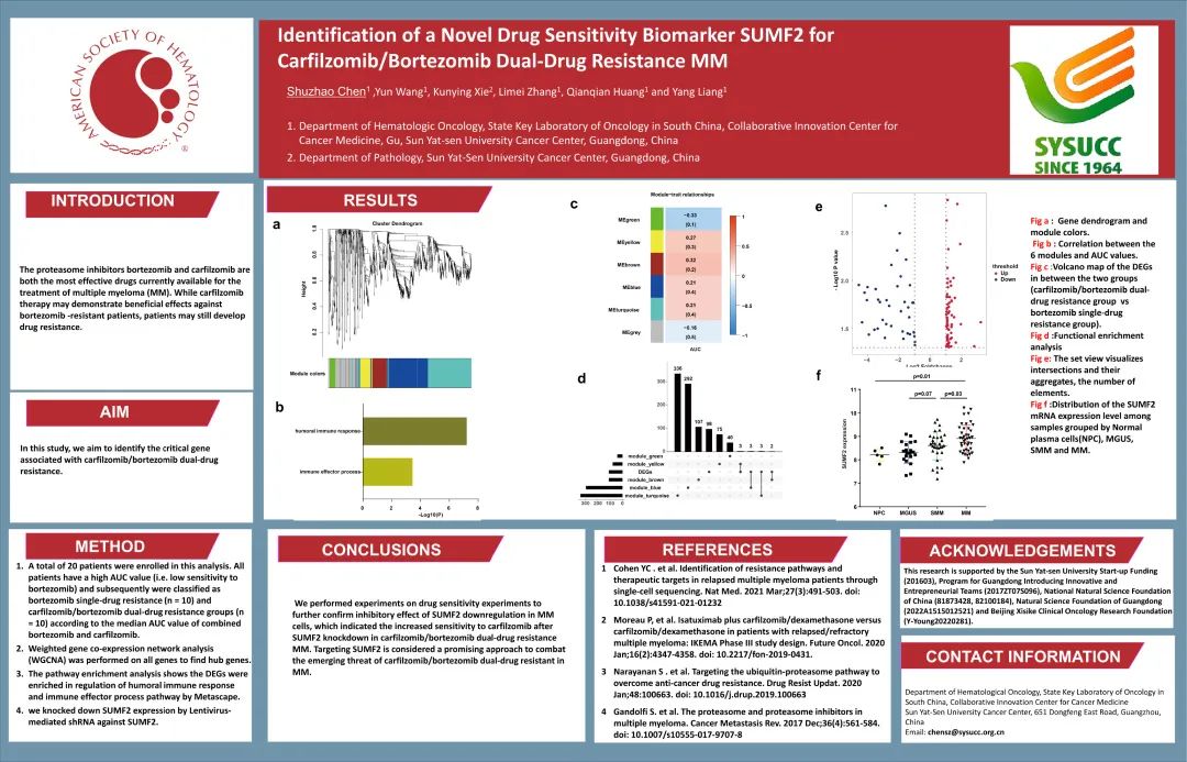 编者按:2022年12月10~13日,第64届美国血液学年会(ASH)在美国路易斯安那州新奥尔良隆重召开,作为全球血液领域中规模最大和内容最为全面的血液学顶级学术盛会,本届ASH一如既往地吸引了众多专家及学者的关注。在本次ASH大会上,中山大学肿瘤防治中心梁洋教授团队报告了一项题为“Identification of a Novel Drug Sensitivity Biomarker SUMF2 for Carfilzomib/Bortezomib Dual-Drug Resistance MM”的研究(abstract 3180),着重探讨了SUMF2作为双重耐药MM患者新药敏感性biomarker的价值,《肿瘤瞭望》特将该研究整理如下并特邀梁洋教授进行介绍和解读。
