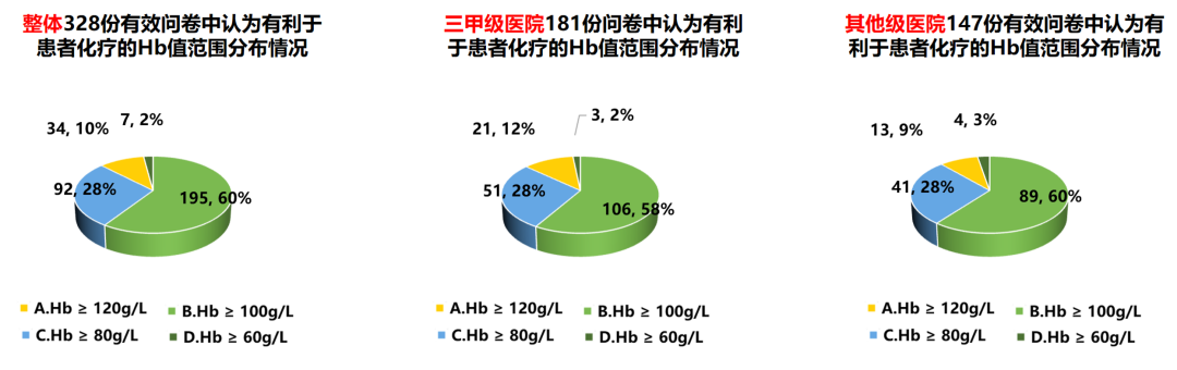 此外,在328份有效问卷的整体分析中,在不限制治疗可及性的情况下,有60%(195)的受访者认为血红蛋白(Hb)≥100 g/L有利于完成预定剂量化疗方案,28%(92)认为Hb≥80 g/L有利于完成预定剂量化疗方案。三甲医院和其他级别医院受访者对此问题的观点分布与整体受访者一致(见图3)。