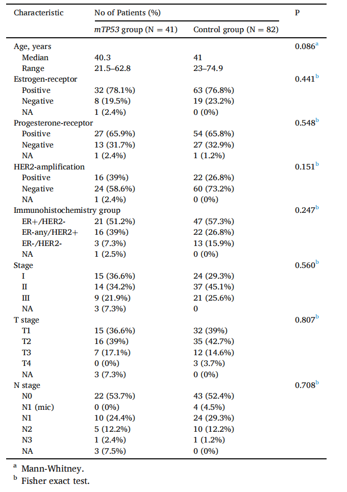 两组中最常见的组织学类型是无特殊类型的浸润性癌(93%和87%)。在mTP53组中,78%的患者为雌激素受体阳性,65.8%的患者为孕激素受体阳性,39%的患者为HER2阳性;在对照组中,76.0%的患者为雌激素受体阳性,65.8%的患者为孕激素受体阳性,26.8%的患者为HER2阳性(表1)。