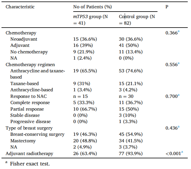 两组患者接受新辅助化疗的比例相似(36.6%)。新辅助治疗后,mTP53组中33.3%的患者达到病理完全缓解(pCR),对照组为36.7%(P=1.000)。表2详细列出了接受辅助治疗和新辅助化疗的反应情况。所有HER2阳性患者均接受新辅助和/或辅助曲妥珠单抗治疗。两组患者乳房切除的比例也相似(分别为48.8%和41.5%;P=0.436)。mTP53组接受辅助放疗的患者比对照组少(63.4%vs 93.9%;P<0.001)。