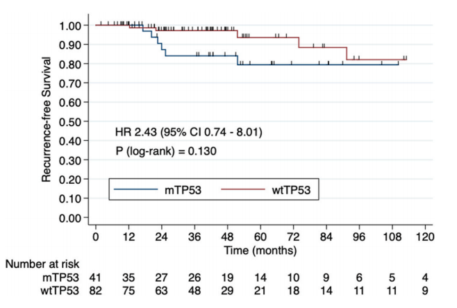 图2.根据TP53状态的乳腺癌相关无复发生存Kaplan-Meier曲线
