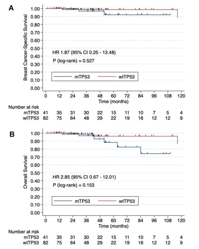 主要终点为无复发生存期(RFS),从乳腺癌诊断之日起一直考虑到局部或远处复发。死亡和第二恶性肿瘤不被认为是RFS事件,因为mTP53患者因第二恶性肿瘤而发生其他肿瘤和死亡的风险增加。次要终点为临床和病理特征、对侧乳腺癌发生率、总生存期(OS)和乳腺癌特异性生存率(BCSS)。