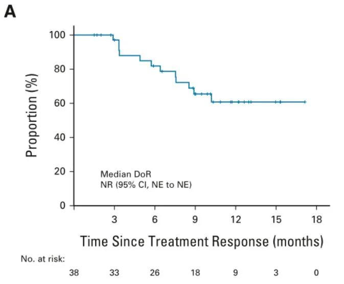 达到缓解的中位时间为2.1个月(四分位范围:1.4~3.1个月,图1B),中位DoR未达到(图2)。