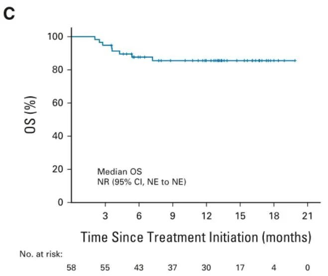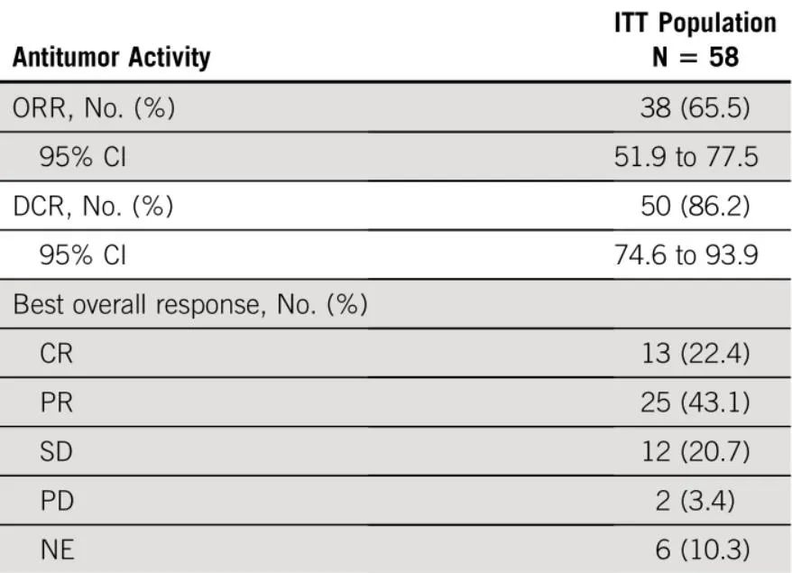 中位随访12.4个月,在52例可评估患者中,确认的总缓解率为65.5%(38例),其中13例达到完全缓解(CR率,22.4%),25例达到部分缓解(PR率,43.1%)[1]。