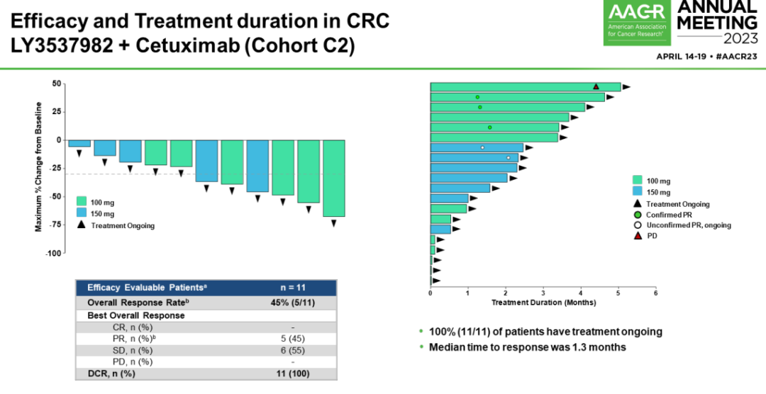 队列C2中接受LY3537982+西妥昔单抗治疗的11例CRC患者可评估:ORR为45%(5/11),5例患者达到PR,6例患者的最佳应答是疾病稳定,DCR为100%。至2023年1月3日数据截止时,所有11例患者仍在接受治疗。至缓解的中位时间为1.3个月。可评估患者定义为接受了至少1次基线后应答评估,或者在基线后评估前已停止治疗的患者。