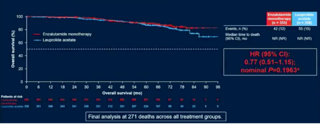 尽管数据仍不成熟(140/271个预期事件),但恩扎鲁胺单药治疗也显示OS延长趋势(HR 0.77,95%CI:0.51~1.15,P=0.1963)。此外,恩扎卢胺单药治疗的至PSA进展时间(HR 0.33,95%CI:0.23~0.49,P<0.0001)、至使用新抗肿瘤治疗时间(HR 0.54,95%CI:0.41~0.71,P<0.0001)也有显著改善。