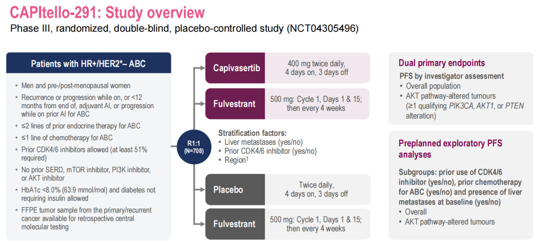 研究结果:总体而言,708例患者被随机分配接受capivasertib+氟维司群(n=355)或安慰剂+氟维司群(n=353)治疗:289例患者(40.8%)的肿瘤发生AKT通路改变;496例患者(70.1%)既往接受过CDK4/6抑制剂治疗;129例(18.2%)患者既往接受过化疗,306例(43.2%)患者有肝转移。在全体人群和AKT通路改变人群中,各治疗组既往接受的治疗大致平衡。