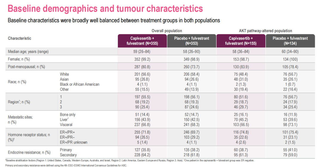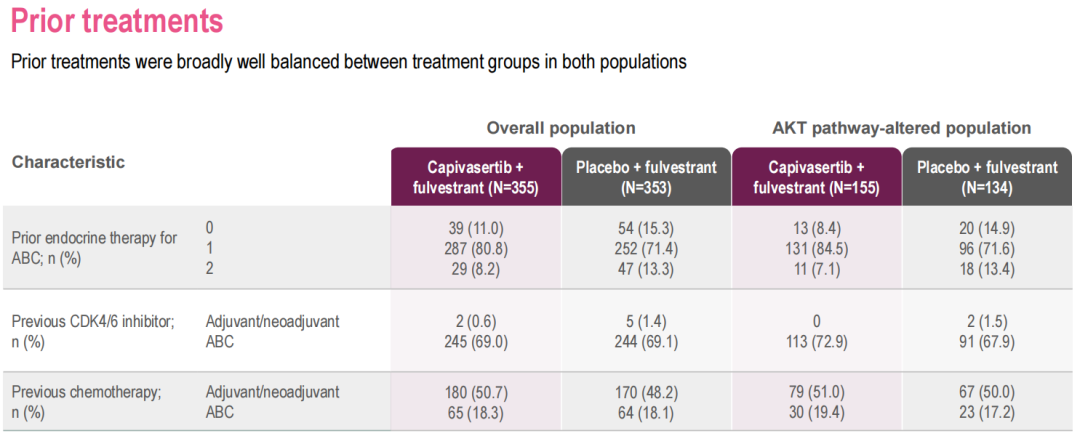 总体人群中,在既往因晚期乳腺癌接受过和未接受过化疗的患者中,我们均观察到了capivasertib+氟维司群使患者有一致的获益。