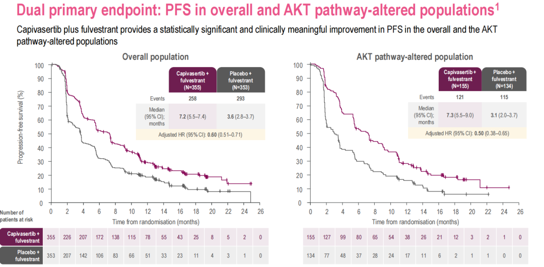在总体人群和AKT通路发生改变的人群中,capivasertib+氟维司群使患者的PFS有显著统计学和临床意义的改善。