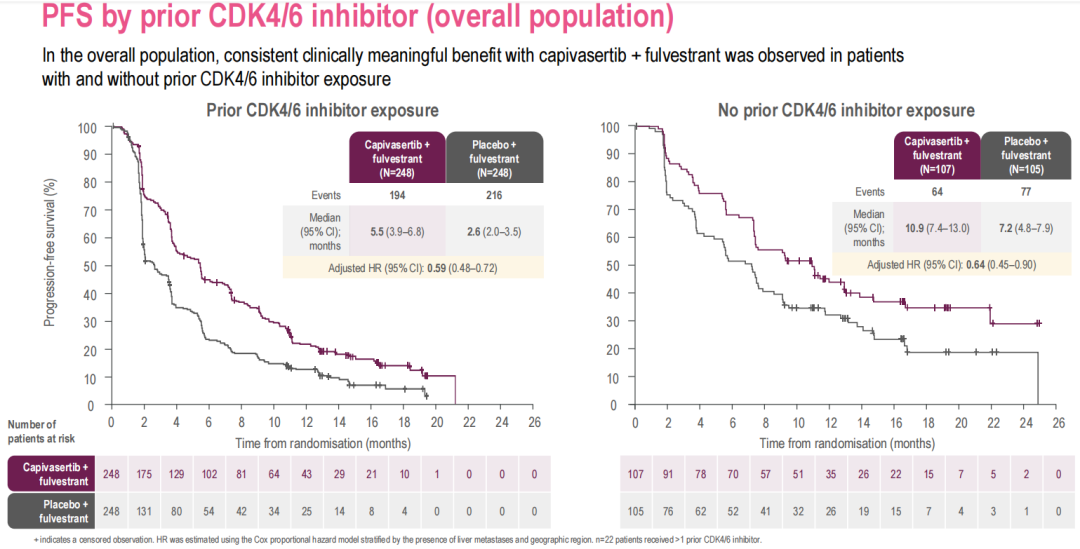 在总体人群中,无论患者既往接受过或未接受过CDK4/6抑制剂治疗,我们均观察到了capivasertib+氟维司群使患者PFS有一致的临床意义获益。既往接受过和未接受过CDK4/6抑制剂治疗的患者中,两组均表现出了显著差异。