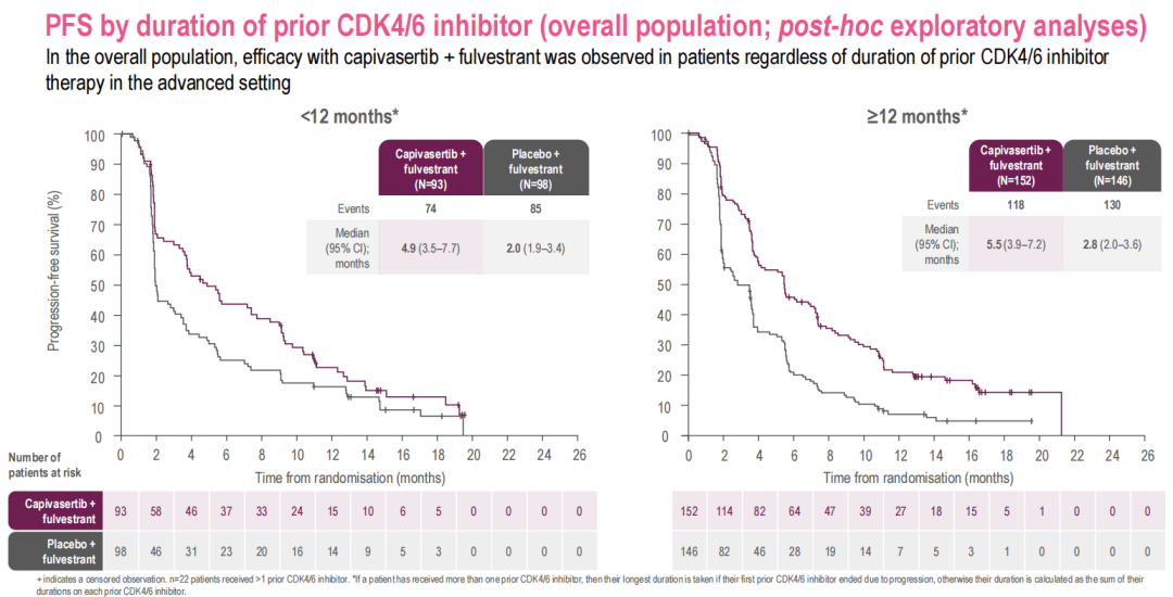 在总体人群中,无论既往CDK4/6抑制剂治疗持续时间如何(<12个月或≥12个月),在晚期HR+/HER2-晚期乳腺癌患者中均观察到了capivasertib+氟维司群组的PFS获益。