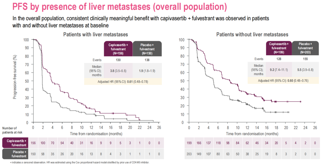 总体人群中,基线有肝转移和无肝转移的患者中,均观察到capivasertib+氟维司群有一致的临床意义获益。