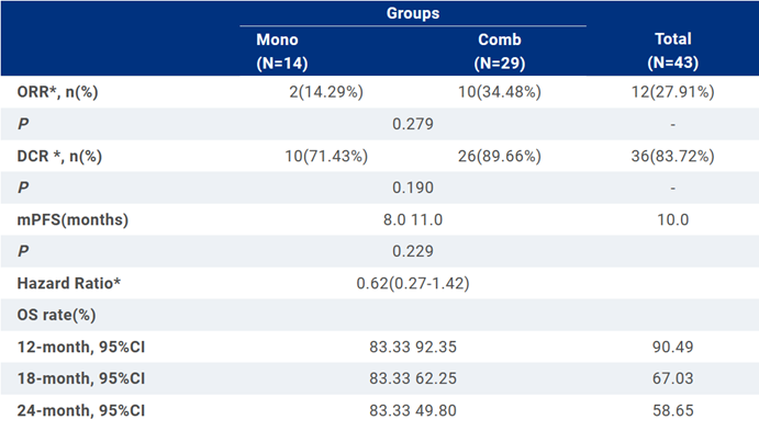 共筛选出43例符合条件的患者并接受TACE联合瑞戈非尼二线治疗,其中29例患者接受了PD-1抑制剂治疗。全部患者中,完全缓解(CR)1例,部分缓解(PR)11例,ORR为27.91%(12/43),疾病稳定(SD)24例,疾病控制率(DCR)为83.72%(36/43)。生存数据见表1。