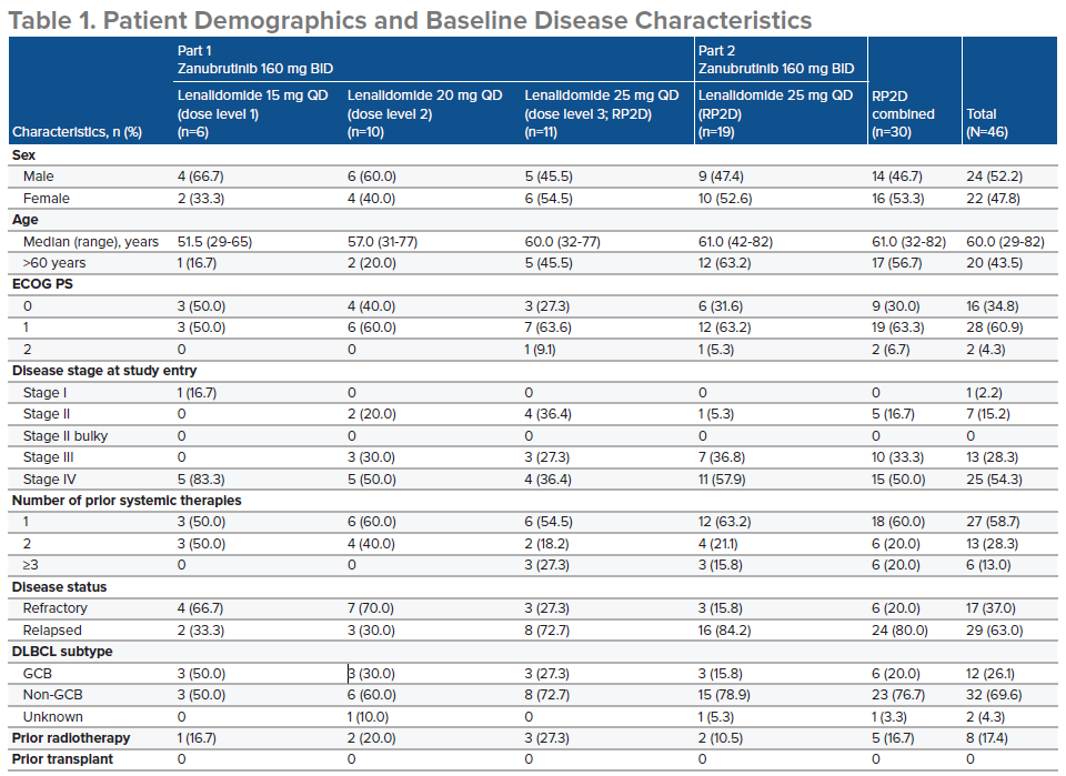 剂量递增部分,患者接受不同剂量水平来那度胺:15mg(剂量水平1),20mg(剂量水平2),或者25mg(剂量水平3),每日1次,在每个28天周期的第1-21天服用。在接受不同剂量来那度胺治疗的同时,联合口服泽布替尼160 mg,每日2次,直至疾病进展或出现不可耐受的毒性。该部分主要终点结果已经公布4,推荐2期剂量(RP2D)为剂量水平3。