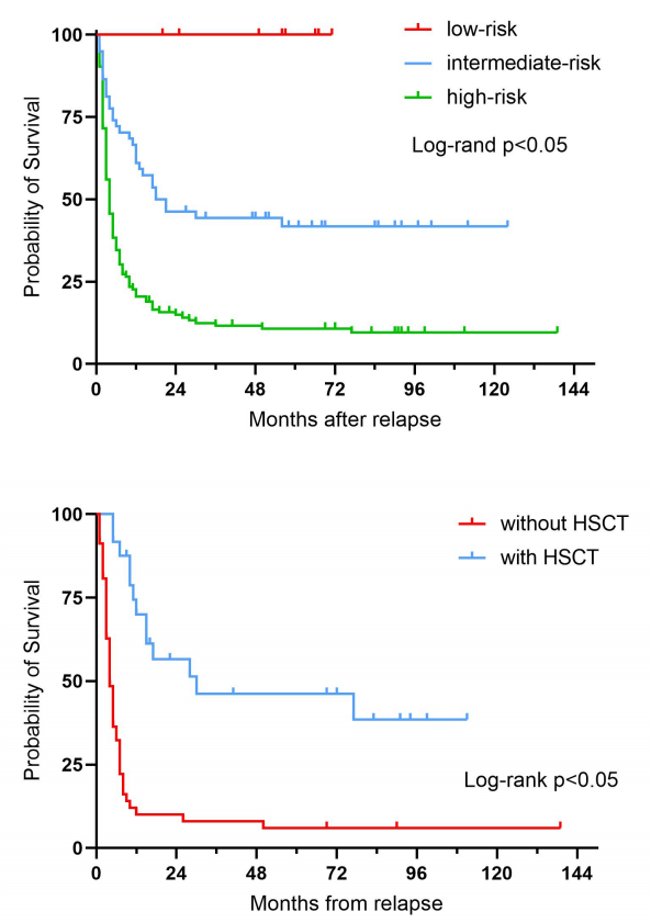 939例患者中,906例(96.5%)诱导治疗后达到首次完全缓解(CR1),217例(24%)至2023年2月复发,复发患者的5年总生存(OS)率23.0%。复发部位包括单纯髓外复发(7%)、单纯骨髓复发(83%)和联合复发(10%),5年OS率分别为79.4%、17.4%和28.6%(p<0.05)。极早期(42%)、早期(31%)和晚期(27%)复发患者的5年OS率分别为8.4%、15.9%和26.7%(p<0.05)。根据UK-ALLR3,复发患者分为标危(4.2%)、中危(28.1%)和高危(67.7%),5年OS率分别为100%、41.0%和10.6%(p<0.05)。134例患者(61.8%)接受了再诱导治疗。二次CR(CR2)率和CR2后的5年OS率分别为64.9%和53.5%。再诱导治疗的81例(55.1%)高危患者中,造血干细胞移植(HSCT)患者的5年OS率46.3%,未进行HSCT患者的5年OS率6.1%(p<0.05)。