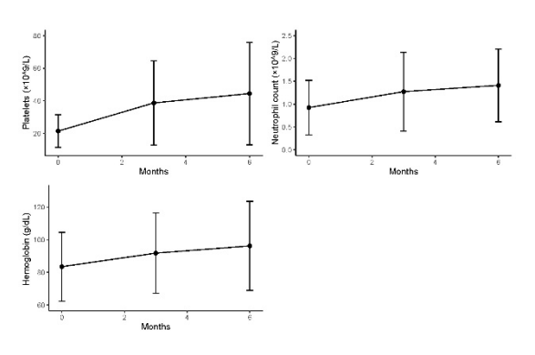 海曲泊帕联合CSA治疗3个月后,15例患者接受随访,ORR 73.3%(11/15),有效的中位PLT和HGB分别为35(22-108)×109/L和92(52-129)g/L,中位ANC 1(0.59-2.85)×109/L。治疗6个月后,15例患者随访,ORR为66.7%(10/15),有效的中位PLT和HGB分别为50(23-112)×109/L和104.5(72-135)g/L,中位ANC 1.56(0.67-3.4)×109/L,如图所示。海曲泊帕治疗6个月后,7/8例TD-NSAA患者随访,5例脱离输血,ORR 71.4%。