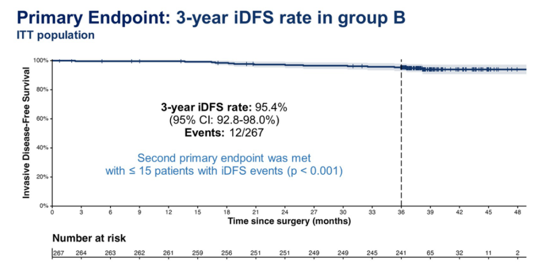 Javier Cortes教授:PHERGain研究有两个主要终点。其中之一是评估未接受化疗的患者在病理学完全缓解方面的初步疗效(B组pCR率,2021年ASCO大会上已经进行了公布)。另一个主要终点是远期预后,即浸润性疾病的存活率,其重要性更高。对于起初未接受化疗的患者,根据其治疗情况决定是否接受化疗。本次ASCO大会上,我们所呈现的是第二个主要终点,即整体患者组的浸润性疾病存活率(iDFS率)。结果显示,B组ITT人群患者的3年iDFS率为95.4%(95%Cl:92.8%~98.0%)。