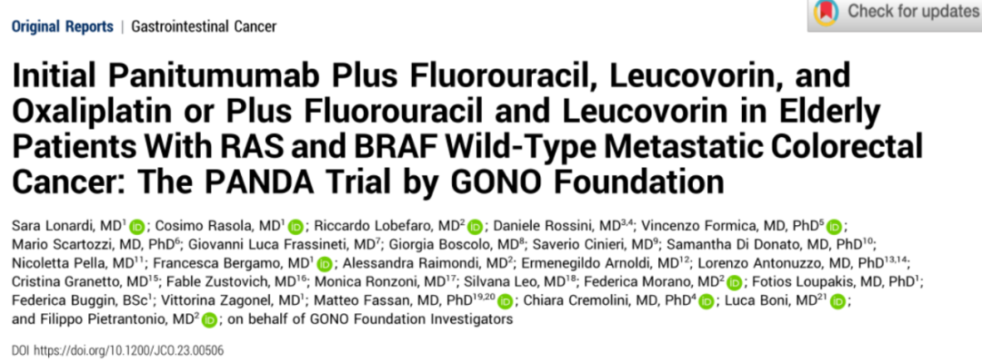 Lonardi S, Rasola, Lobefaro R, et al. Initial panitumumab plus FOLFOX or 5-FU/LV in elderly patients with RAS and BRAF wild-type metastatic colorectal cancer: the PANDA trial by GONO Foundation. J Clin Oncol. Published online August 3, 2023.