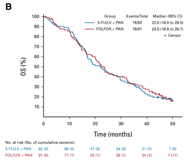 在2016年7月至2019年4月期间,共有185例患者被随机分组,A组和B组各有1例在试验开始前退出试验,因此最终在校正的意向治疗人群中,91例患者被随机分配到A组,92例患者被随机分配到B组;而由于B组中有1例患者接受了PAN+mFOLFOX治疗,因此在安全性评估时,A组有92例,B组有91例。